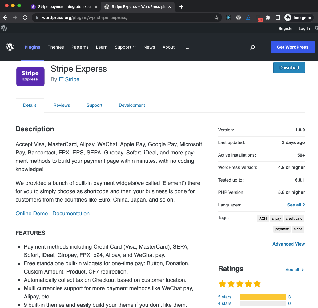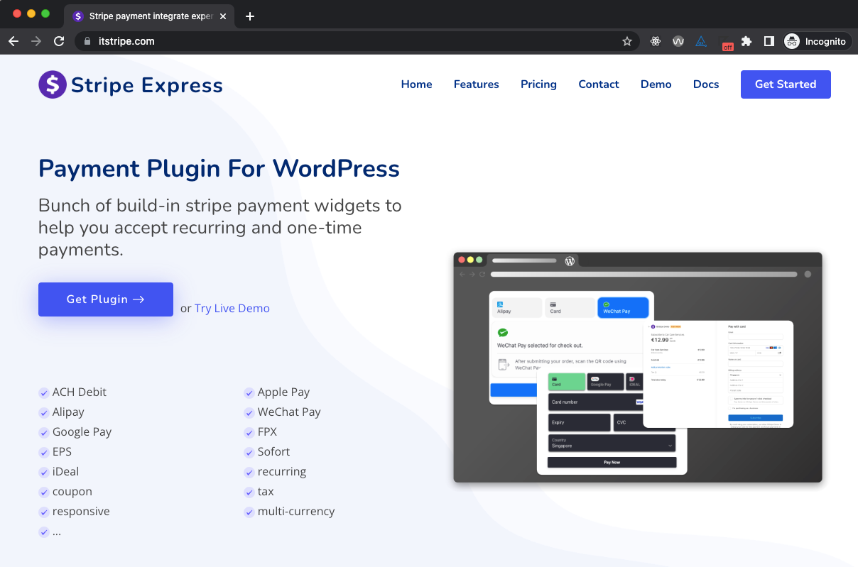 简单来说,Stripe Express 是一款针对wordpress 平台,帮助你使用 stripe 快速,方便完成跨境支付的一款免费插件(扩展功能收费)。其中,包括多种已经创建好的支付组件,包括一次性支付(one-time),电子钱包(支付宝,微信,Apple Pay, Google Pay,下面重点会提到微信和支付宝),表单支付等等组件,需要提及的是,上面的组件都支持常见的各种信用卡,Master card, Visa, 等等等等,以及其他国家地区的主流支付方式比如 Bancontact, FPX, EPS, SEPA, Giropay, Sofort, iDeal。